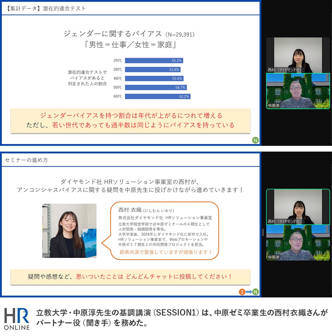 テストを受けた西村さんが、「自分にはバイアスはないと思っていたのですが、予想以上のバイアスがあることがわかりました」と告白すると、中原教授も「(バイアスは)私も持っているし、誰もが持っている。だからこそ、うまくつきあっていく方法を考えるのです」と答えた。中原教授自身は、プレゼンなどの資料で、男性のビジネスパーソンのイラストを使いがちな傾向があるようで、そうならないための確認を怠らないようにしているという。視聴者のチャットに、「(わたしの方法は)発言の前に一呼吸おくこと」というコメントがあった。発言するときや何かを決定するときは、気持ちに余裕を持って、“いま一度確認すること”が大切なのだろう。
