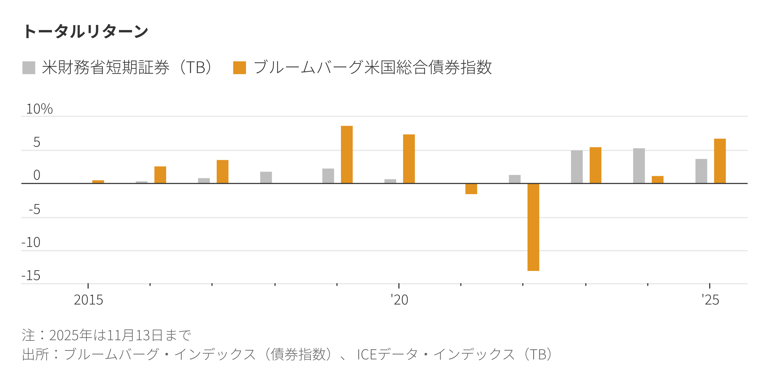 このところ債券市場にとってほぼ全てが追い風となっている。米連邦準備制度理事会(FRB)は利下げを進めてきた。雇用の伸びと個人消費が鈍化し、さらなる利下げへの期待を維持しているが、企業のバランスシートを脅かすような差し迫った景気後退を示すものではない。ドナルド・トランプ大統領の関税が物価を押し上げるとの懸念があるにもかかわらず、インフレ圧力は引き続き緩和している。広く注目されているブルームバーグ米国総合債券指数は、物価変動と利払いを考慮した2025年のリターンが約6.7%となっている。このままいけば、年間リターンは2020年以来の高水準となる見込みだ。債券市場は、FRBのインフレ対策によって22年が史上最悪の一年となった後、持ち直していた。主に米国債、投資適格社債、政府系機関の住宅ローン担保証券(MBS)で構成されるブルームバーグ米国総合債券指数は23年に5.5%のリターンを記録したが、24年にはほぼ停滞していた。