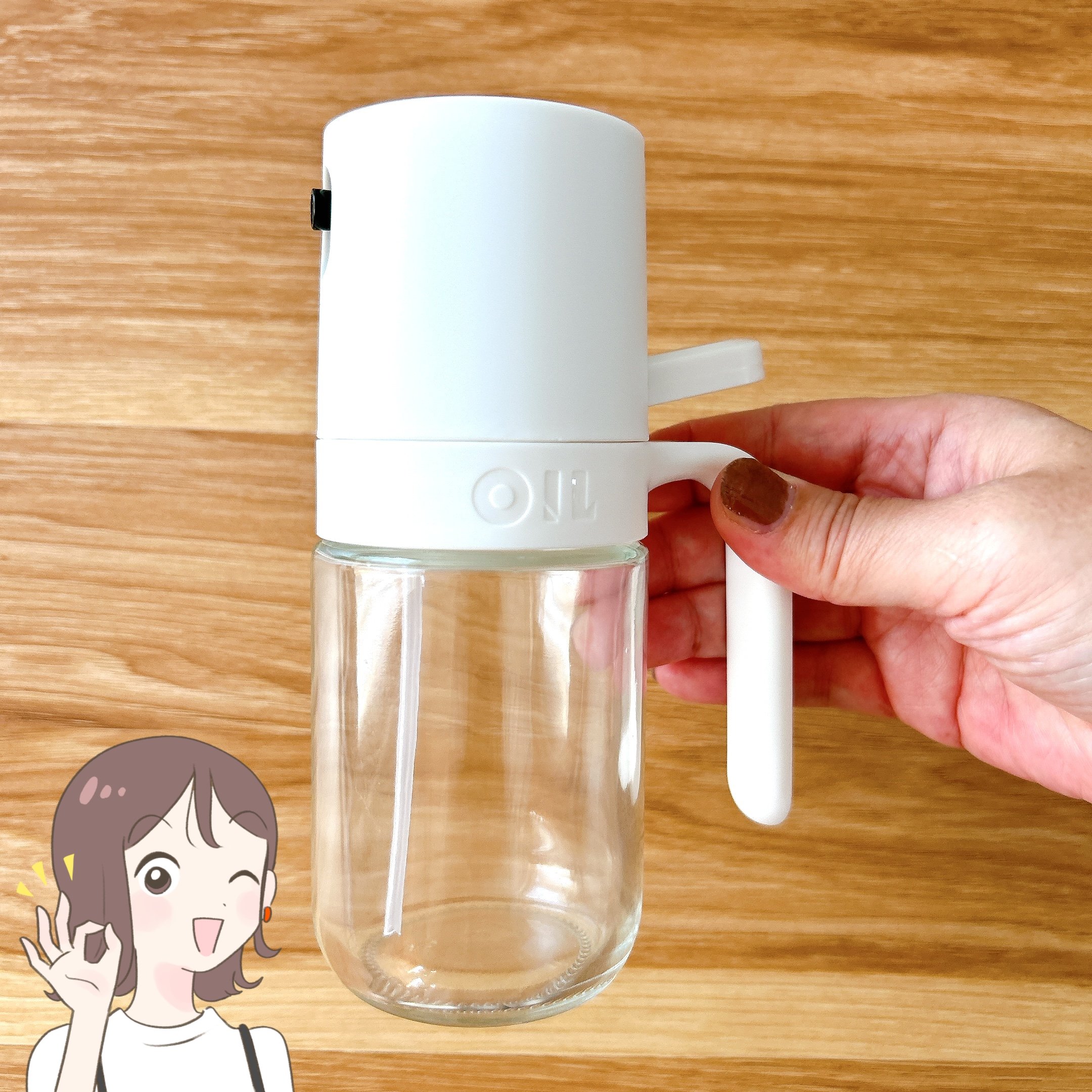 価格は498円です。ソーダガラスに白いスプレーのフタが付いたオイルボトルです。フライパンに油を引くときに「出しすぎちゃった……」と後悔することが多いのですが、それが解決できる画期的なアイテム!