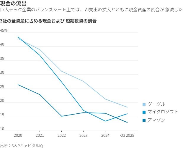 直近の決算期末だった今年9月末の時点で、マイクロソフトの現金および短期投資が全資産に占める割合は約16%と、2020年の約43%を下回った。アルファベットとアマゾンの相対的な現金ポジションも、AIインフラへの支出によって膨張した資産との対比で、著しく低下している。