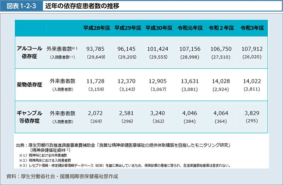 「令和6年版 厚生労働白書」によると、アルコール依存症の患者は10万人以上いて、薬物依存症やギャンブル依存症と比べても圧倒的に多いことが分かります。潜在的な患者数を含めると、もっと多いでしょう。