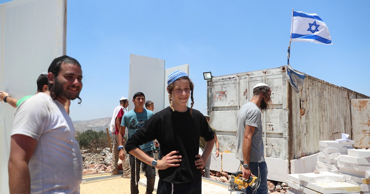 ユダヤ人入植地「エビアタル」で、プレハブ小屋の建設に取り組むユダヤ人入植者=2021年6月27日、筆者撮影