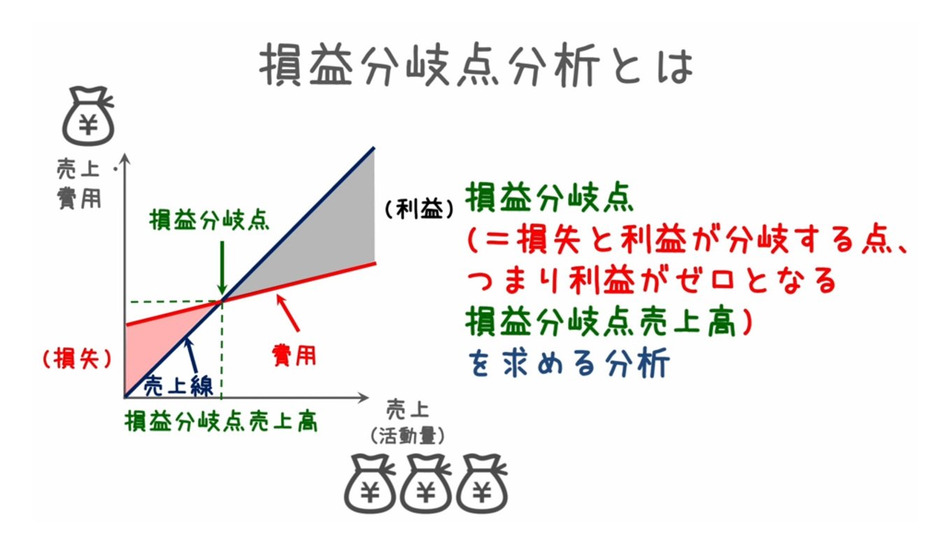 損益分岐点とは、損失と利益が分岐する点のことをいいます。言い換えると、「どれくらい売り上げを上げれば利益が出るのか」を示すラインです。