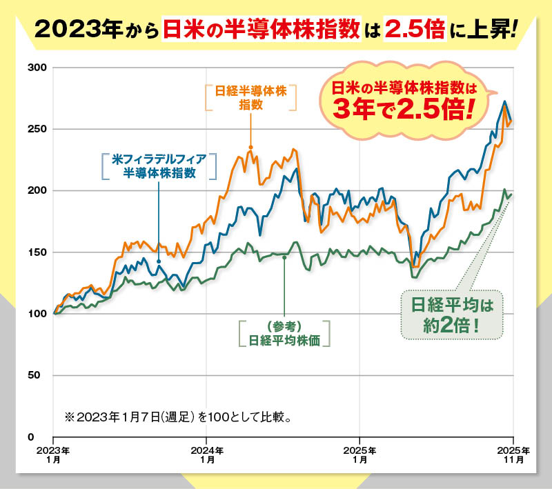 生成AIが株式市場の主要テーマとなり始めた2023年からの推移をみると、日米の代表的な半導体株指数は、約3年間で2.5倍になっている。