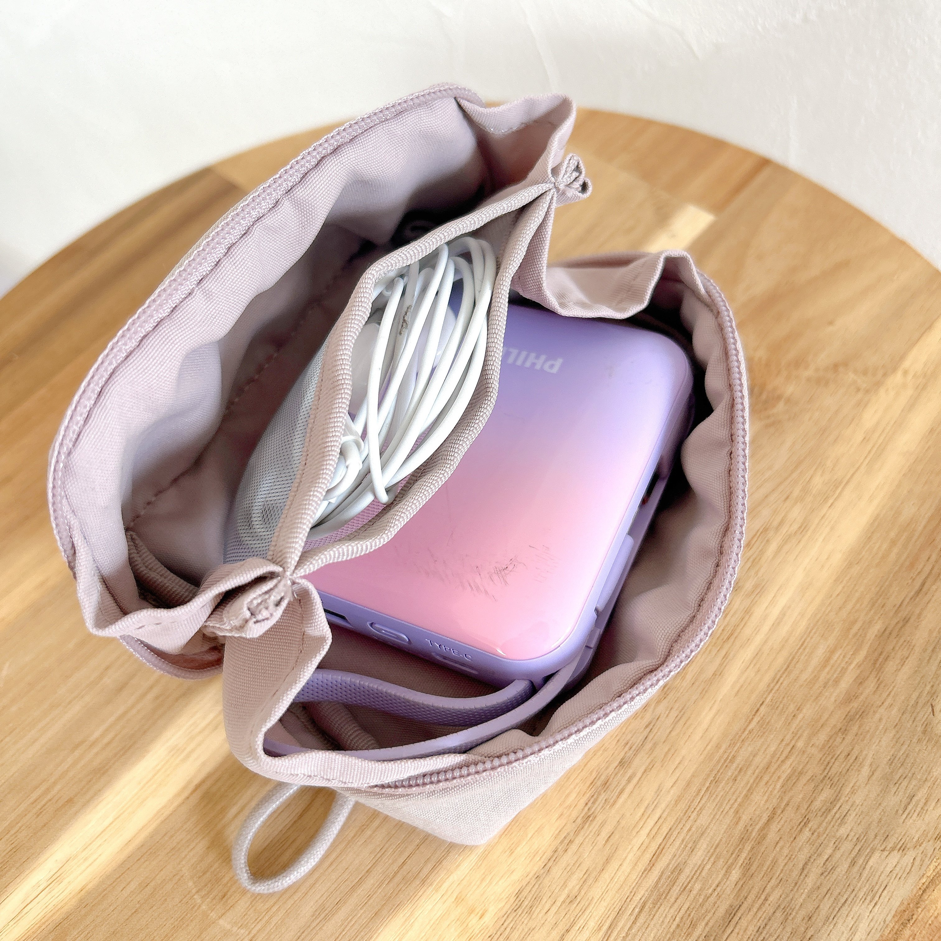 コンパクトなモバイルバッテリーも入り、ガジェット類の持ち運びにも便利。コード付きのイヤホンも、メッシュポケットに挟めば絡まりません。