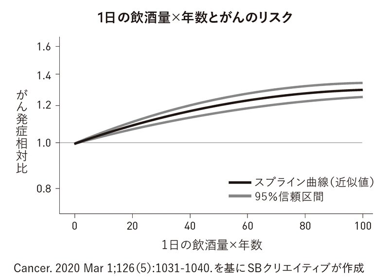 日本人を対象とした研究では、下のグラフのように、少量のアルコール(1日1ドリンク)を飲み続けただけで、10年間における累積のがん発症リスクが5%上昇することが分かりました。