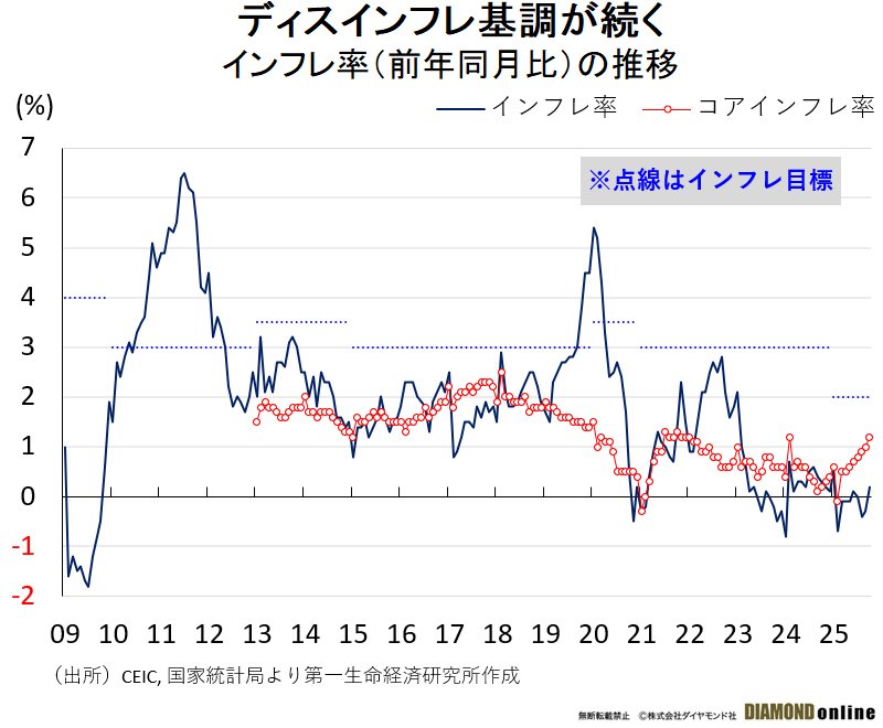 中国経済は足元で供給サイドがけん引役となり、鉱工業生産や米国以外への輸出が景気を下支えしている。一方、不動産不況や雇用回復の遅れ、節約志向の拡大で家計部門の力強さは欠く。米中摩擦はいったん緩和したものの、内需喚起策の効果は息切れしつつあり、需給ギャップ拡大によるデフレ圧力が強まる構図に変化はない。(第一生命経済研究所主席エコノミスト 西濵 徹)