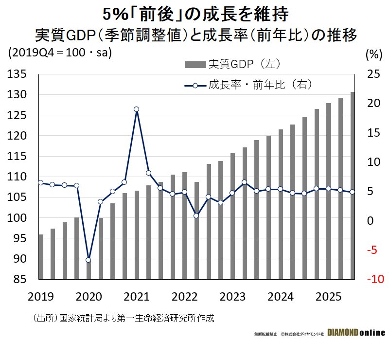その一方、ここ数年の不動産不況に加え、コロナ禍以降の若年層を中心とする雇用回復の遅れも重なり家計部門は節約志向を強めるなか、習近平指導部が主導する腐敗防止を目的とする「倹約令」も影響して、小売売上高は力強さを欠いている。