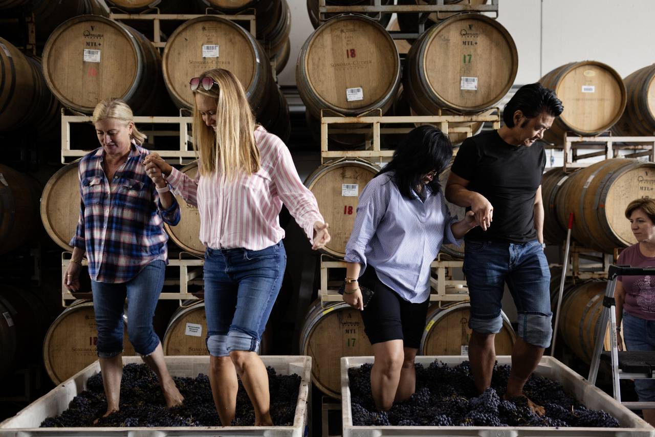 不動産投資家のリサ・ロスさんはきつい手仕事をするためにやって来た。しかし気付くと濃い紫色のブドウに足首まで漬かっていた。ロスさんは靴を脱ぎ、足を消毒して、みずみずしいブドウでいっぱいの巨大なおけに足を入れた。それから力を込めて足踏みを始めた。「ブドウの冷たい小さな茎がちょっと足のマッサージのようだった」とロスさんは話した。「冷たくて気分がすっきりした」作業は重労働でもあった。ロスさんは義母と手をつないで足踏みした。義母は柔らかくなったブドウで何度も滑った。ブドウ踏みは、ソノマ郡ワイン生産者協会が主催する特別な体験ツアーの一部だった。参加者は、疲れるけれどワクワクするワイン造りの経験に大枚をはたくことをいとわない人々だ。