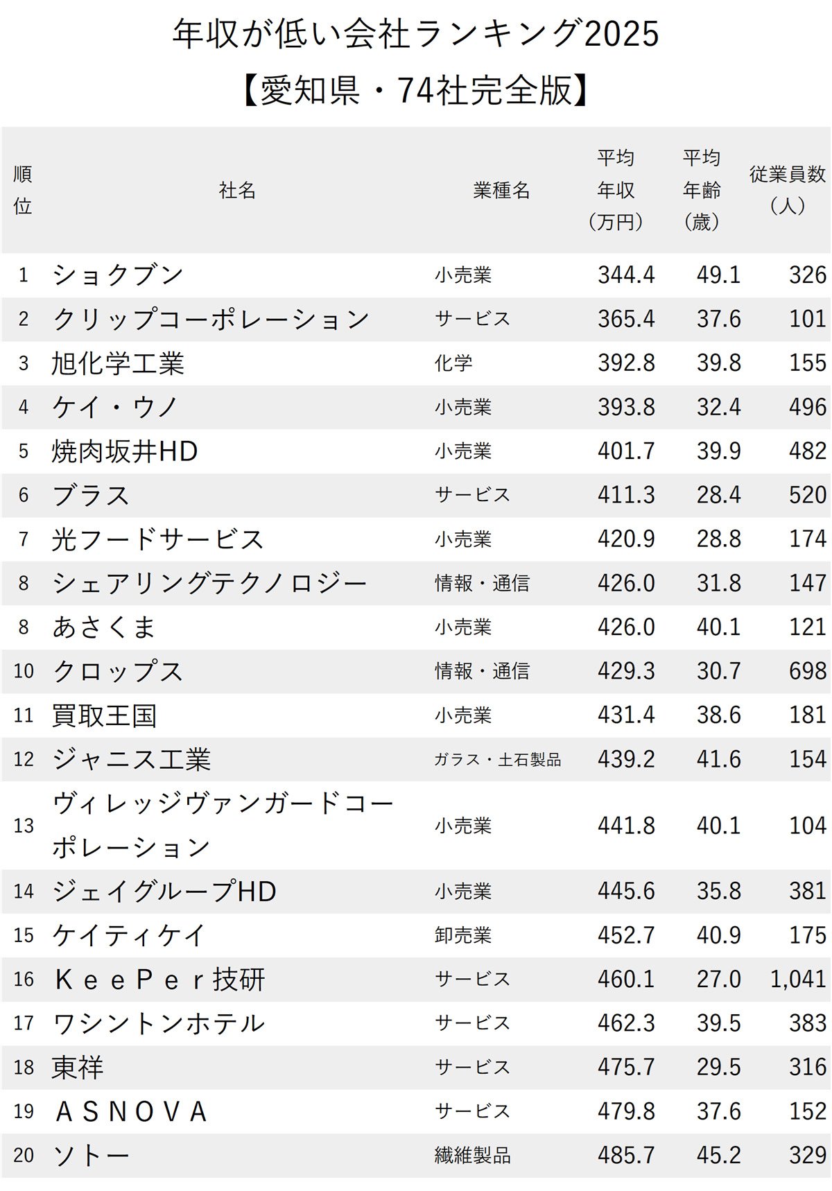 年収が低い会社ランキング2025【愛知県・全74社完全版】ネクステージ、ゲオ、アルペンは何位? ダイヤモンド・ライフ編集部 マネー・投資ニッポンなんでもランキング! 2025年11月24日 7:00 記事をクリップ URLをコピー 記事を印刷 Xでシェア Facebookでシェア はてなブックマークでシェア LINEでシェア noteでシェア 拡大画像表示 次のページ 21~40位はこちら 1 2 3 4 5 記事をクリップ URLをコピー 記事を印刷 Xでシェア Facebookでシェア はてなブックマークでシェア LINEでシェア noteでシェア 有料会員限定機能です詳細はこちら おすすめの会員限定記事 こいつ、採用しちゃダメだ…面接で「モンスター社員」を一発で見破る、超シンプルな質問とは? 絶対に採用しないで!面接で「40代から成長しなくなる人」を一発で見抜く魔法の質問〈2025年度上期・会員ベスト2〉 関連記事 年収が低い会社ランキング2025【1000社完全版】200~300万円台が63社 ダイヤモンド・ライフ編集部 年収が高い会社ランキング2025【愛知県・174社完全版】トヨタがまさかの4位、グループの意外な「年収序列」は? ダイヤモンド・ライフ編集部 年収が高い会社ランキング2025【全1000社・完全版】年収1000万円超は133社! ダイヤモンド・ライフ編集部 「AIに負けて職を失う人」と「人手不足で年収を上げる人」の決定的な違い 丸山貴宏 特集 あなたにおすすめ