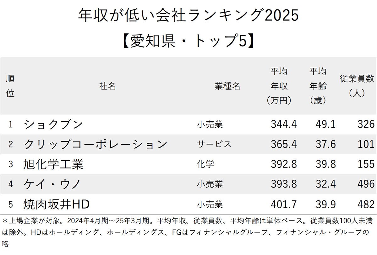 上場企業の有価証券報告書に記載された平均年収のデータを使って、愛知県に本社がある上場企業を対象に「年収が低い会社ランキング2025【愛知県】」を作成した。本社所在地はダイヤモンド社企業情報部調べ。対象期間は2024年4月期~25年3月期。平均年収、従業員数、平均年齢は単体ベースで、従業員数100人未満は除外した。