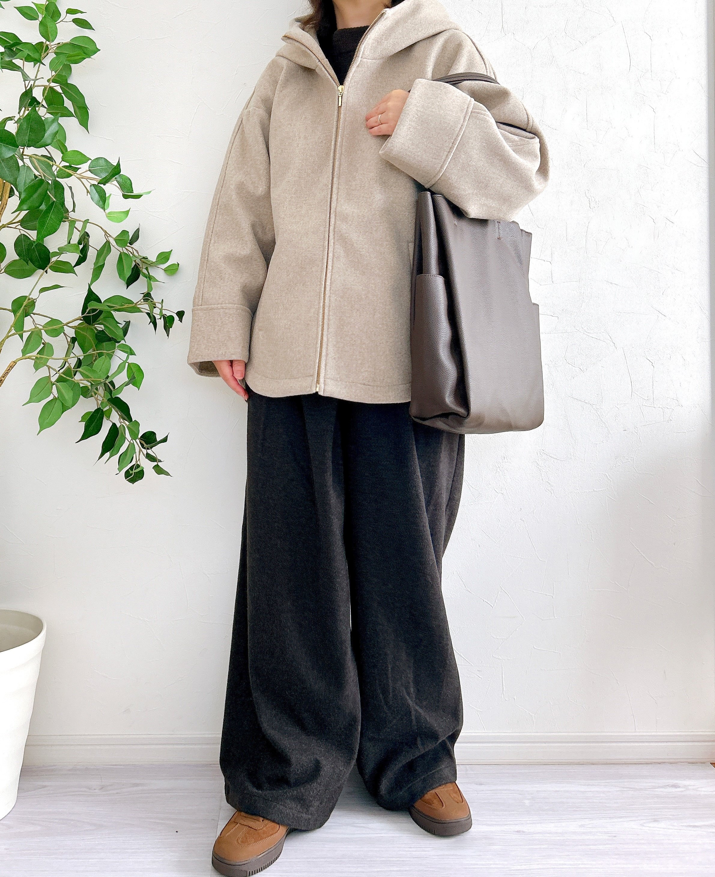 固めの生地ですが、ワイドな着心地なので窮屈さはありません。厚手のニットの上からでも着用できるし、ドロップショルダーで腕も動かしやすかったです。