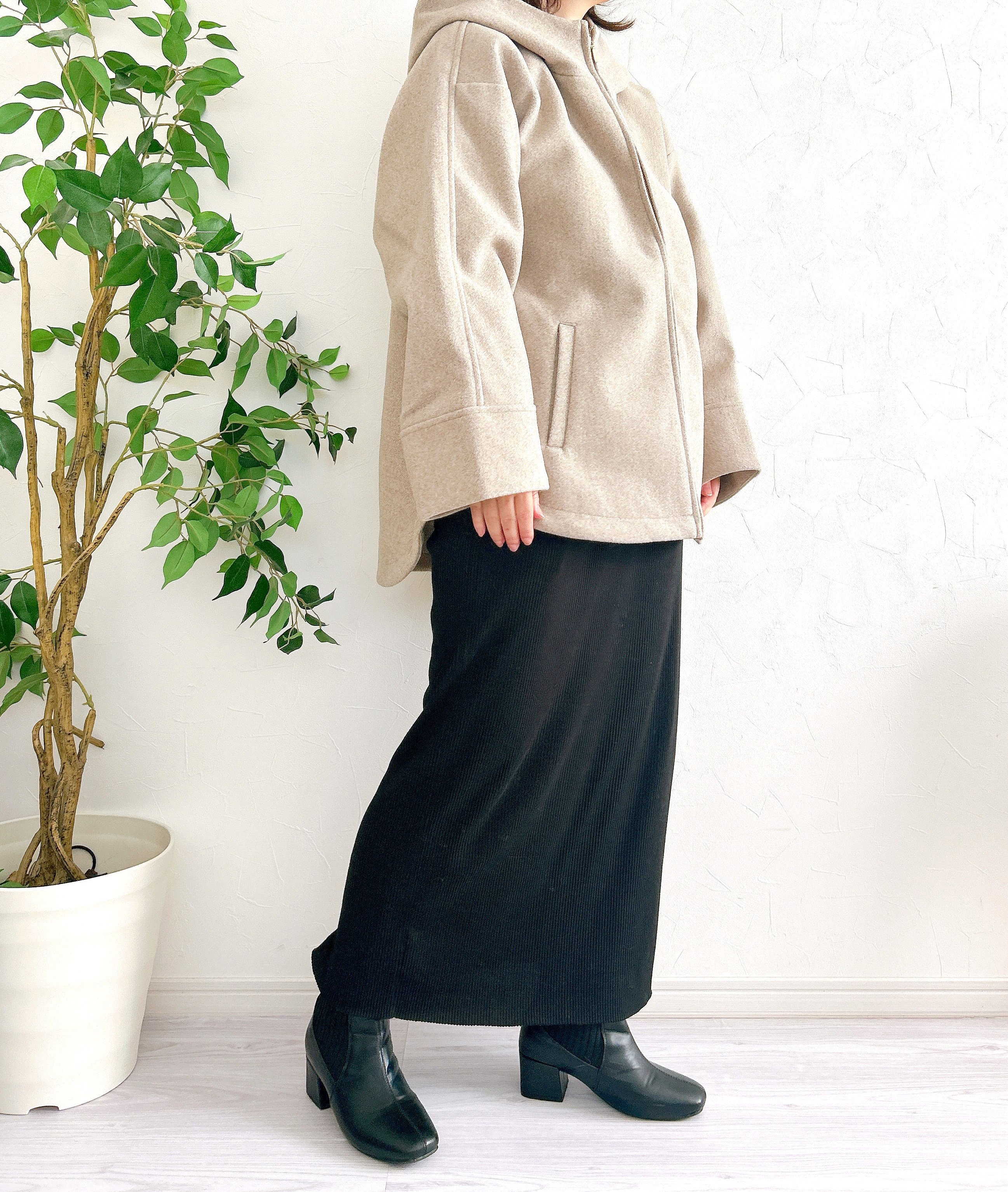 ロングスカートとのコーデも、バランスが良くきちんと見えてオシャレ!ダウンジャケットと比べると重さはありますが、手軽にキレイめコーデを楽しむことができますよ。