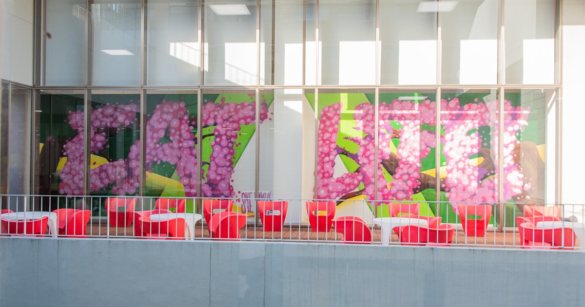 ニューヨークのアーティストであるアレックス・スメツキー氏がMEISEI HUBの壁に描いた縦3.8m、横13mの大壁画「EAT LIFE!」(自分の力を使い尽くせ!)