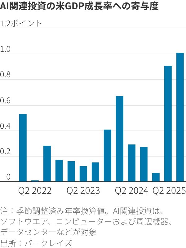 今年上半期の実質GDP(国内総生産)成長率のうち、半分は企業のAI投資によるものだった可能性がある。AI関連株の上昇は個人資産も押し上げ、消費支出の拡大につながっている。この数カ月はそうした流れが顕著だ。