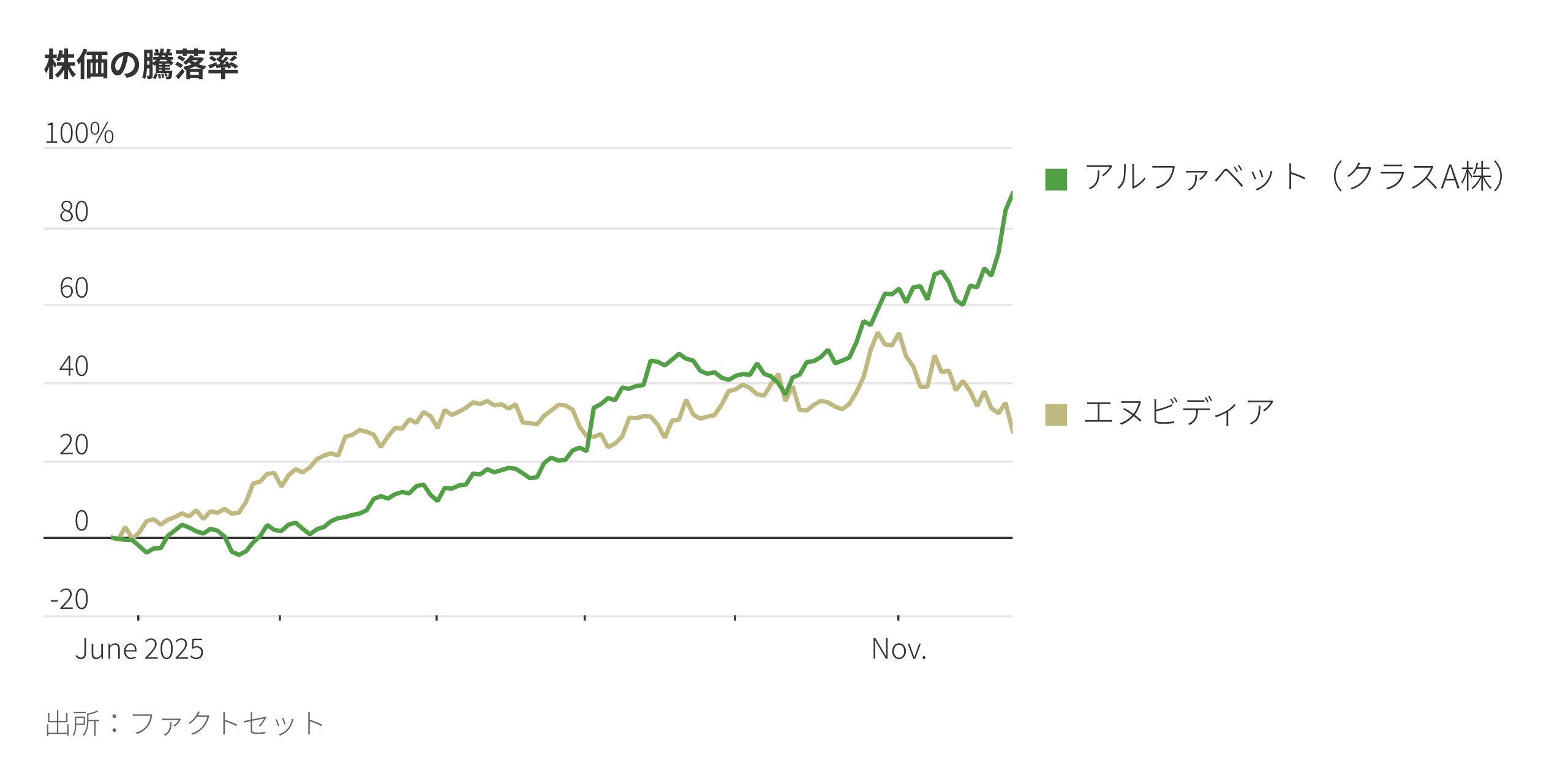 投資家たちは、「人工知能(AI)トレード」の主要2社を反対方向へと動かしている。グーグルの親会社である米アルファベットは25日、時価総額4兆ドル(約625兆円)達成に向け一歩前進、1%以上上昇して数カ月にわたる上昇基調を続けた。アルファベットのAIツール、クラウドコンピューティング、そして半導体事業への期待によって支えられた。一方、半導体大手エヌビディアの株価は25日に2.6%下落。時価総額ベースで世界最大の同社は、数週間前に評価額が5兆ドルに達した後これを下回っていたが、この水準からさら後退した格好となる。25日の両社の異なる動きは、米メタ・プラットフォームズがグーグルのAIチップに数十億ドルを投じる交渉を進めているとの報道を受けたものだ。グーグルのAIチップは、エヌビディア製品の数少ない代替品の一つとなっている。