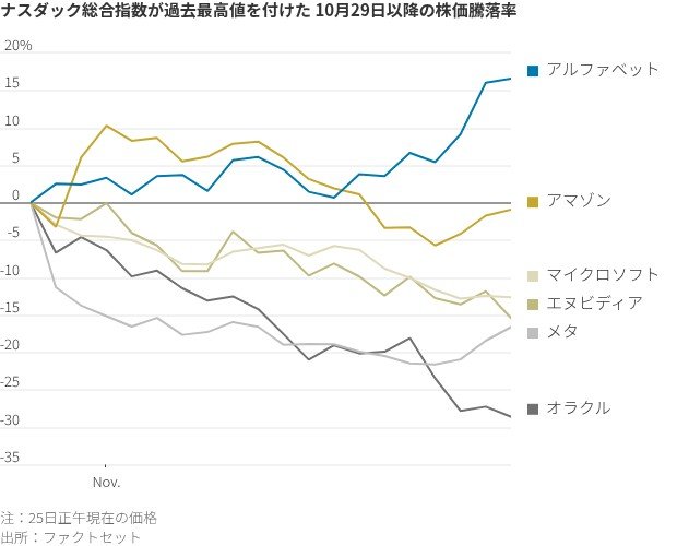 一方、マイクロソフト、オラクル、エヌビディア、メタ・プラットフォームズの株価は、10月29日以降の下落率が2桁に達している。マイクロソフトは13%安で、時価総額もアルファベットを下回った。ファクトセットのデータによると、この逆転は2018年半ば以来のことだ。
