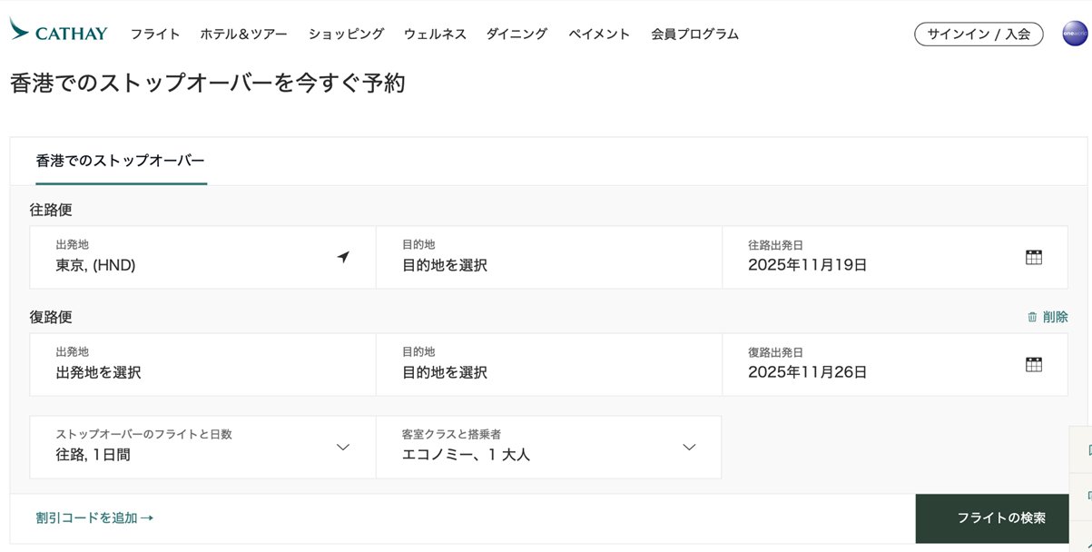 先の2社と同様に、専用サイトでストップオーバー付きのプランを予約する。一例として、2月21日~28日、東京~タイ・プーケットを香港経由のストップオーバーで予約した場合、18万0560円~だった。