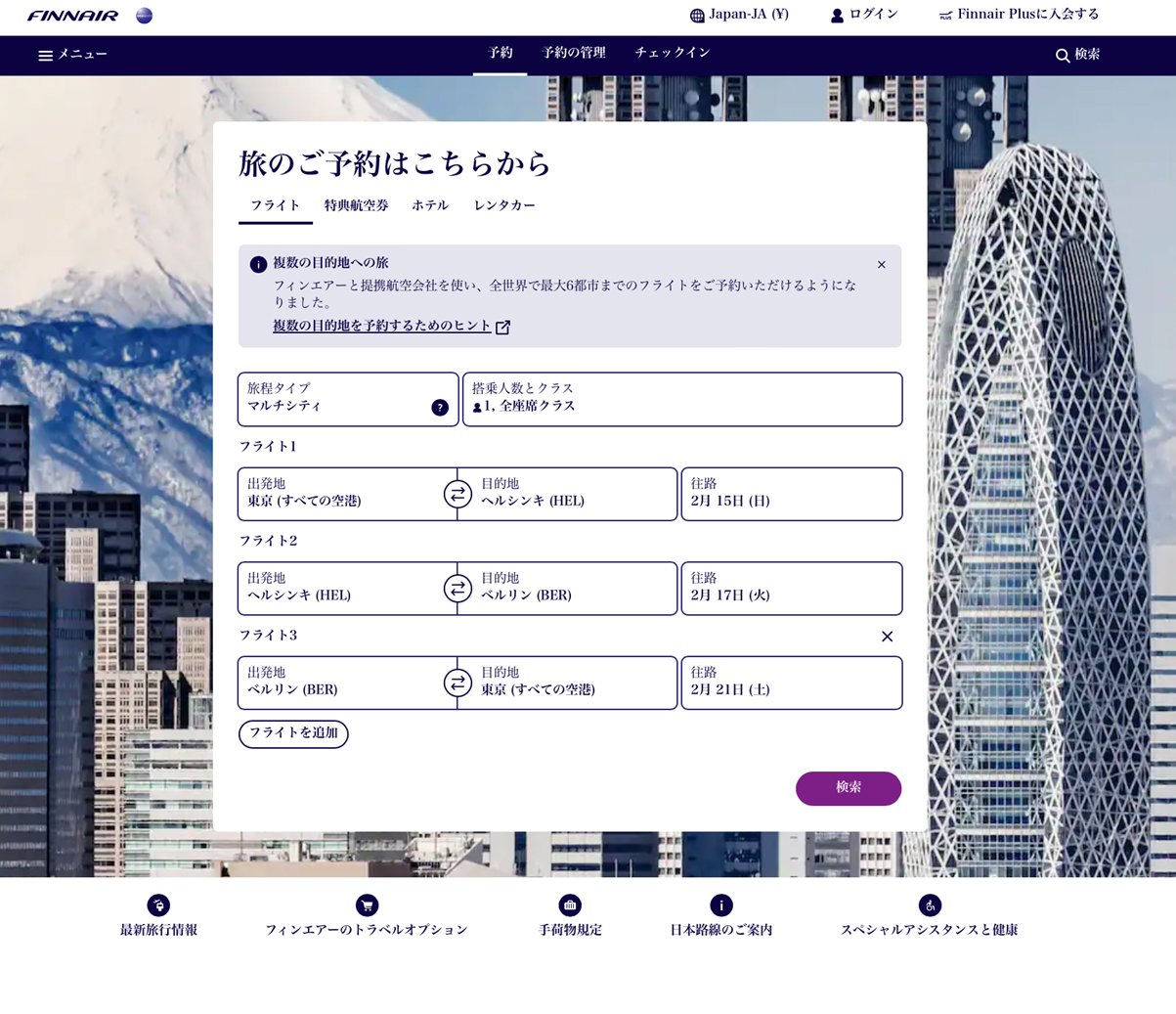 予約は公式サイトで「マルチシティ」の旅程を選び、ヘルシンキ滞在日数を入力。一例として、東京を2月15日に出発し、ヘルシンキに17日まで滞在、その後ベルリンに向かって2月21日に帰国する場合、24万8200円~だった。