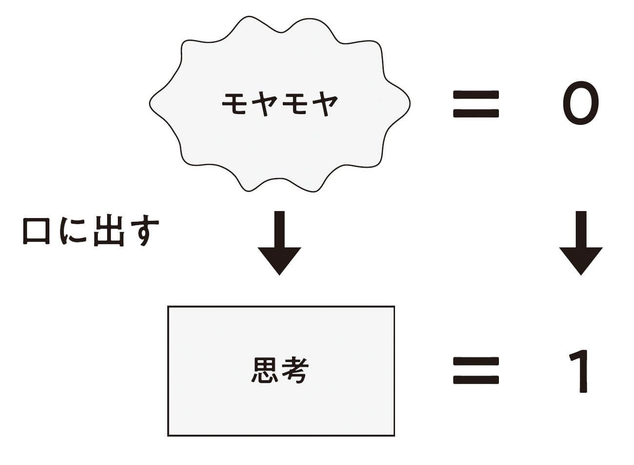 この過程のファーストステップになるのが、モヤモヤをとにかく言葉にしてみること。曖昧なままでも口から外に出して、誰かに話してみる。これが思考化の第1段階、ファーストステップ、いわば「思考のゼロイチ」です。