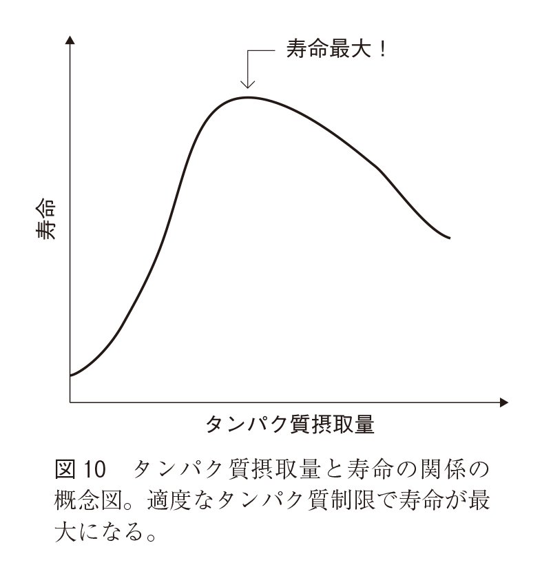 通常、動物の体内では「タンパク質を一定量摂取したい」という欲求がある。したがって、自由に食事を摂らせると、寿命が最大になる、つまり図10の山の頂点に来るような位置よりも多くタンパク質を摂取する。