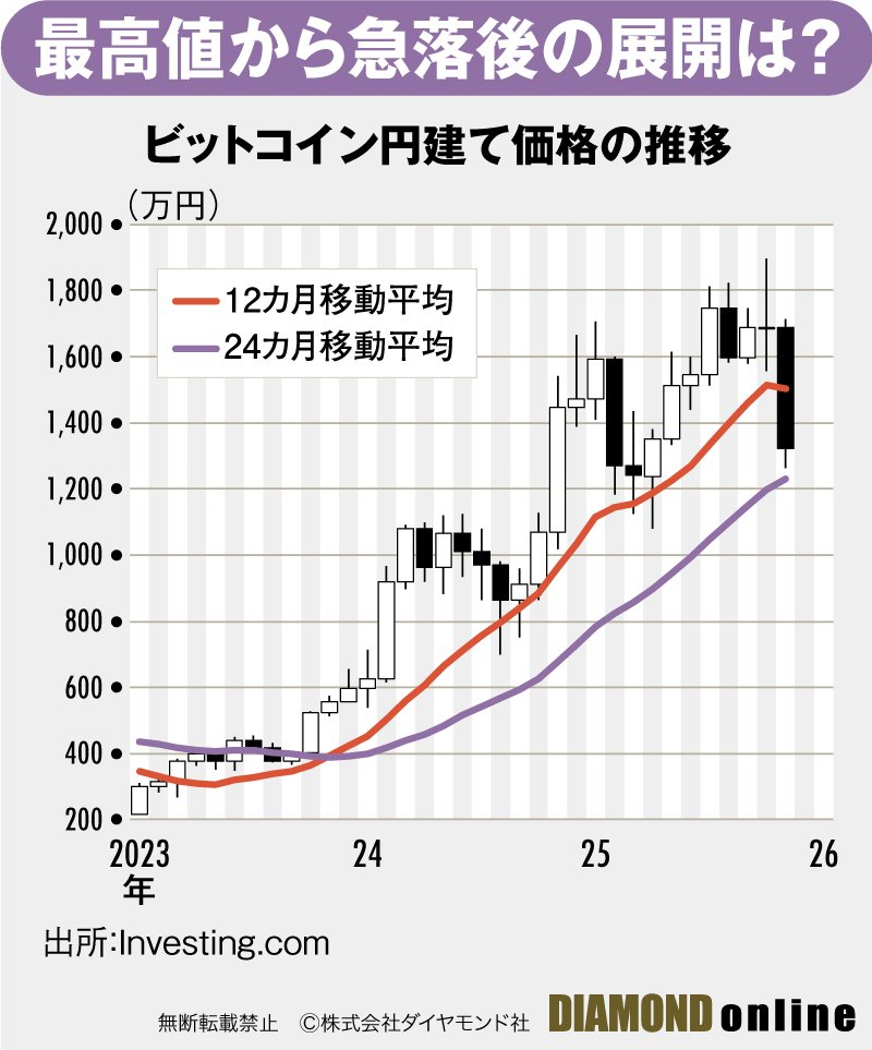 2025年のビットコイン相場は、4月に1200万円を割り込む調整を見せた後、10月上旬に1900万円に迫る過去最高値を更新した。しかし11月下旬には1300万円割れを一時記録し、ピークから30%超の水準訂正を余儀なくされている(下図参照)。