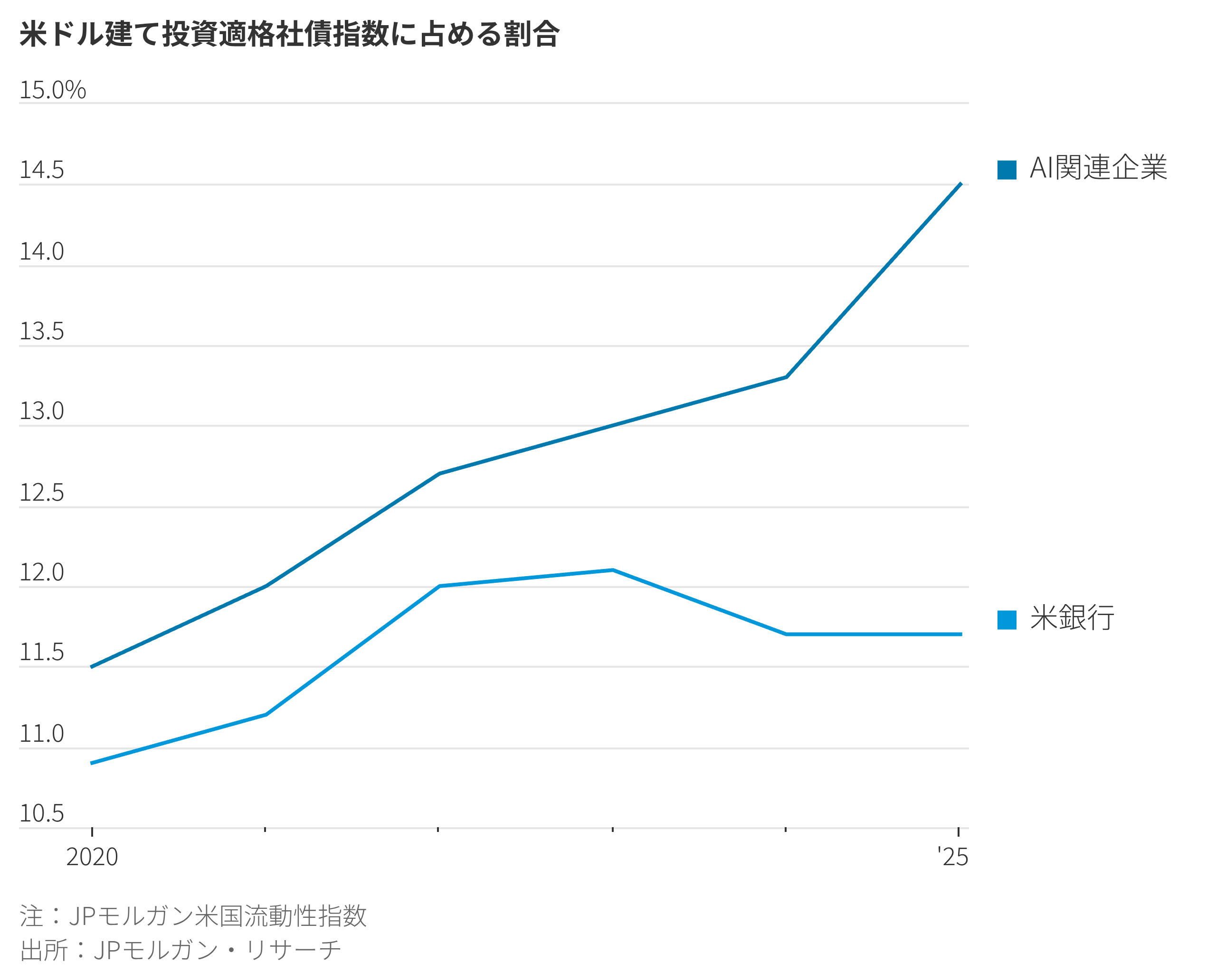 米株式市場が人工知能(AI)事業を手掛ける企業に支配される中、一部の投資家は卵を少し別のかごに移したいと考えるかもしれない。例えば、債券市場への分散投資だ。では、社債市場もAI主導になり始めた場合はどうなるのか。大手テクノロジー企業が、データセンターや半導体、その他のAI関連インフラへの巨額投資資金を調達するため相次いで債券市場に参入している。公益事業会社など、多額の借り入れを行う他の業種の企業も、半導体事業に関連するさまざまなエネルギー需要に応えるための投資を迫られている。こうした債券が債券市場や、その動きに連動するファンドでより大きな割合を占めるようになるにつれ、市場全体への幅広いエクスポージャーを求める投資家らは、本当に分散投資ができているかを確認する必要がある。