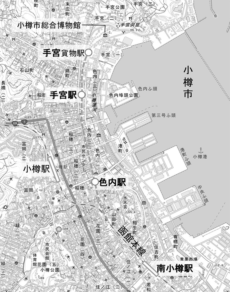 地理院地図。令和7(2025)年8月14日ダウンロード。現在の地図に旧手宮線などを書き込んだ(同書より転載)。 拡大画像表示