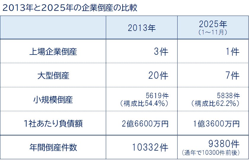 2013年と2025年(1~11月)の上場企業倒産、大型倒産(負債100億円以上)、小規模倒産(負債5000万円未満)、1社あたり負債額などを比較すると表の通りとなった。