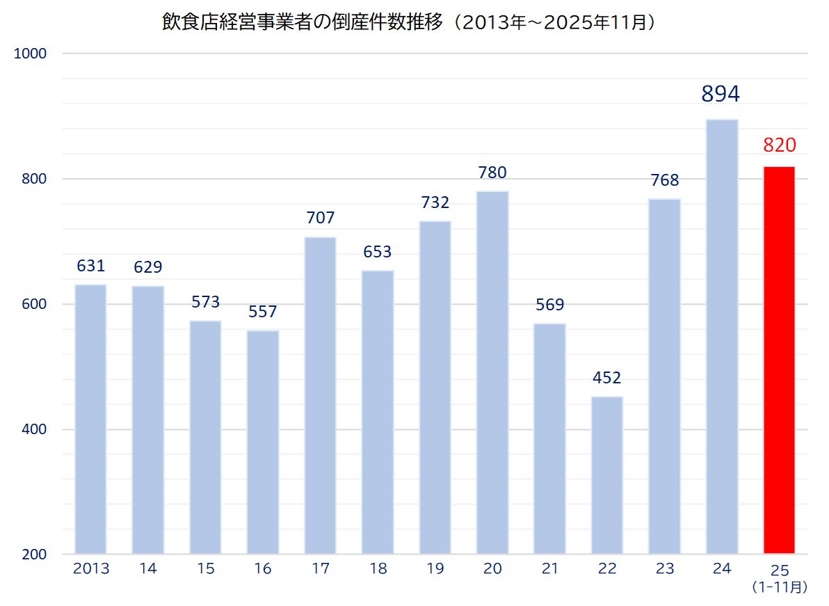 飲食店経営事業者の倒産は、2024年(894件)に過去最多を更新し、2025年は1-11月で820件発生した。このままのペースで推移すると、通年で初の900件超えとなる可能性が高い。