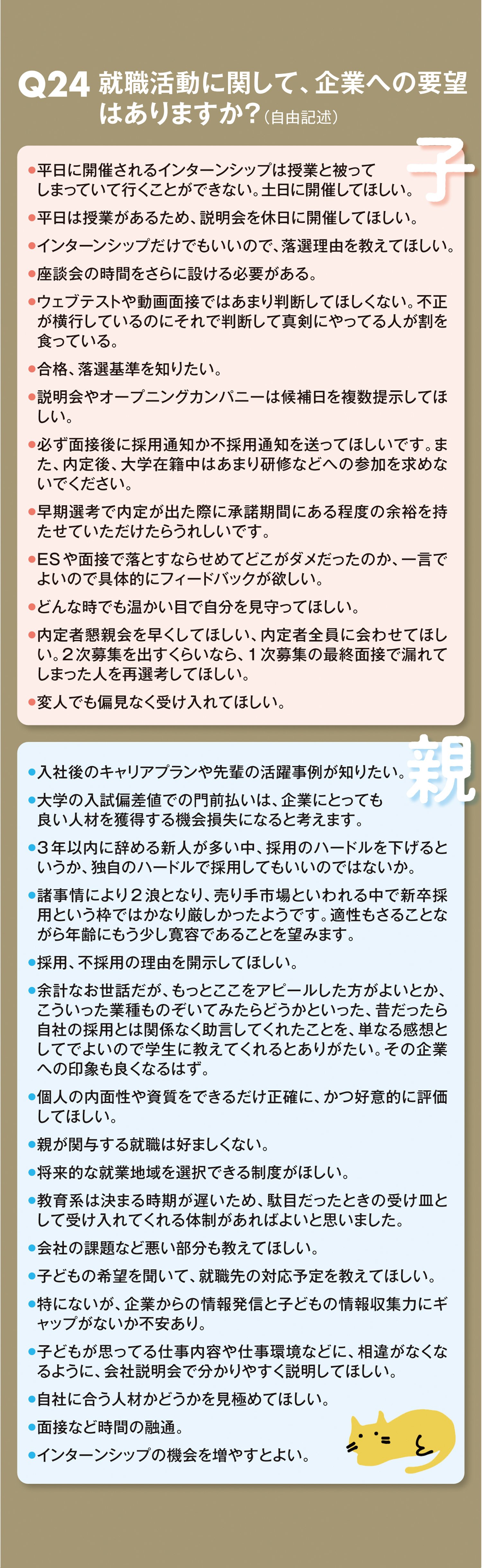 親子ともに就活の長期化に伴い学業との兼ね合いを心配する声が多く、同時にさらなる情報開示を求める声が多く寄せられた。