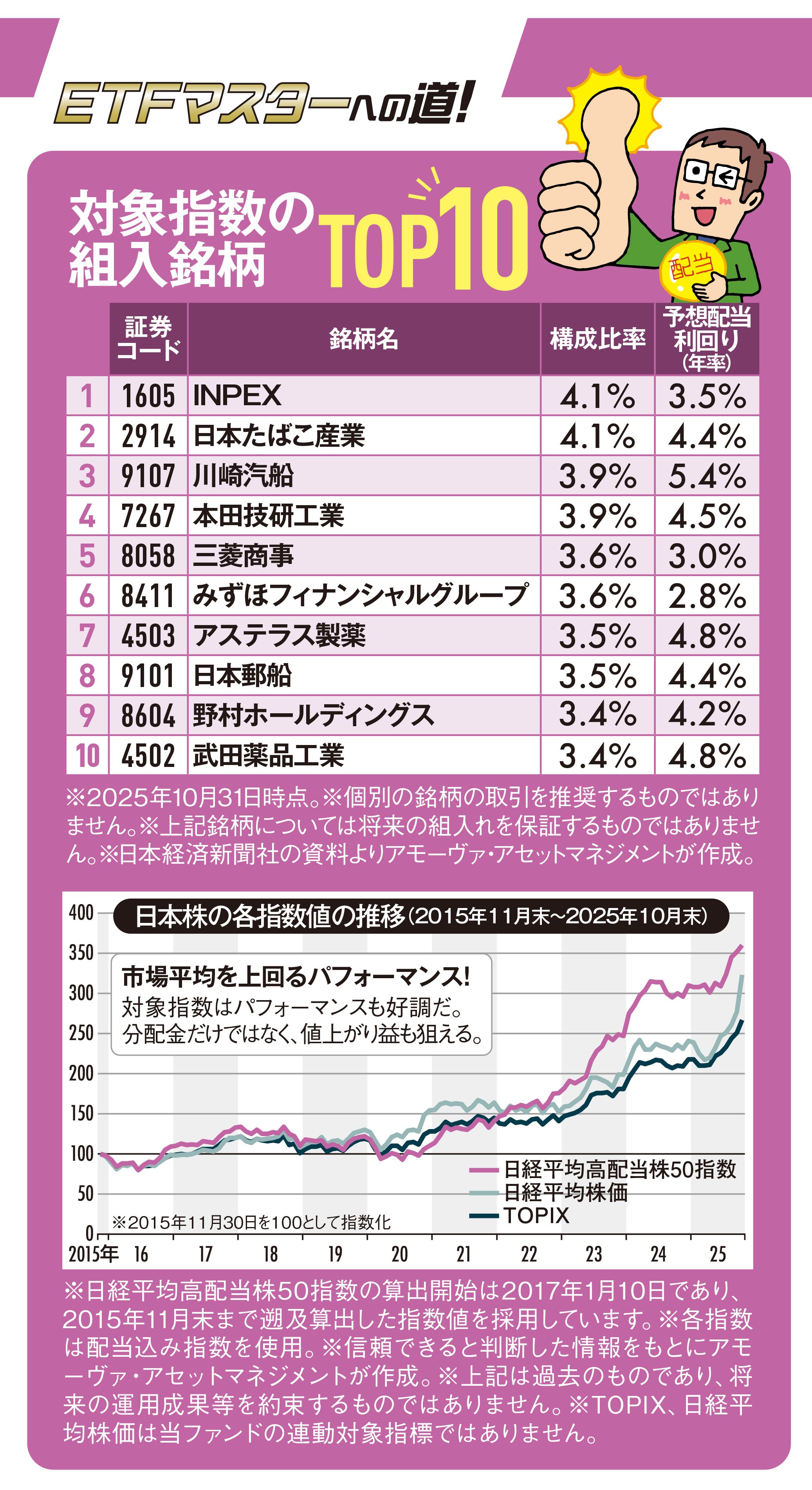 対象指数の配当利回りは、25年10月末時点で3.97%。日経平均株価の1.50%、TOPIXの2.15%を上回っている。