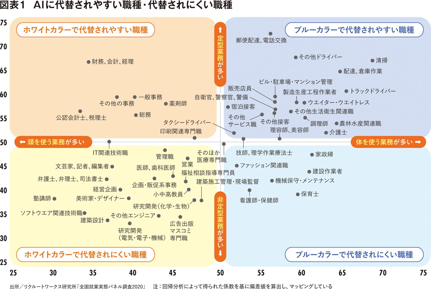 坂本氏はその調査結果をクロス分析し、図表1を作成した。縦軸がAIや機械などへの代替のしやすさ、横軸が頭を使う業務が多いか・体を使う業務が多いかを表している。「AIなどによって仕事が代替されやすいかどうかを、定型業務の割合の大小によって決まるという前提で判別した」(坂本氏)。