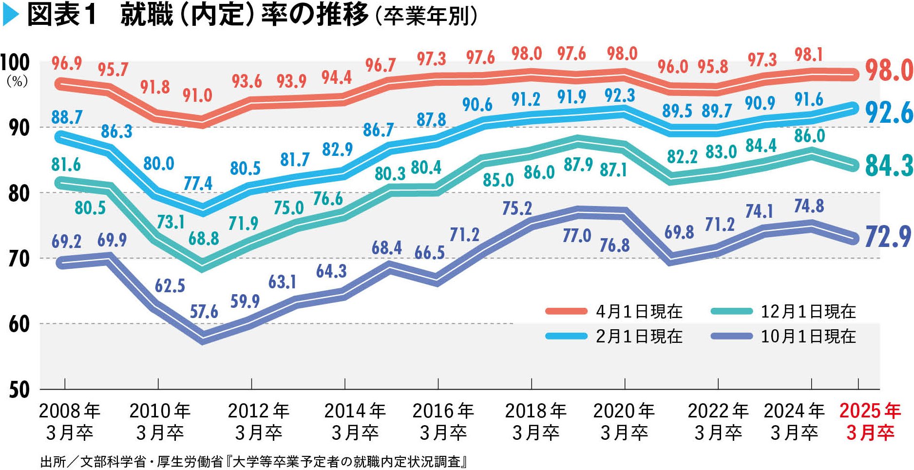 政府の発表によれば、2025年卒の大学生の就職率は25年4月1日時点で98.0%と前年同期比0.1ポイント低下したものの、依然高い水準にある(図表1参照)。