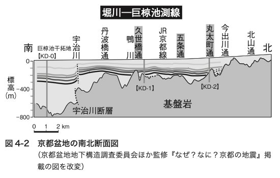 図4-1は京都盆地の東西方向の断面を、図4-2は南北方向の断面を示しています。
