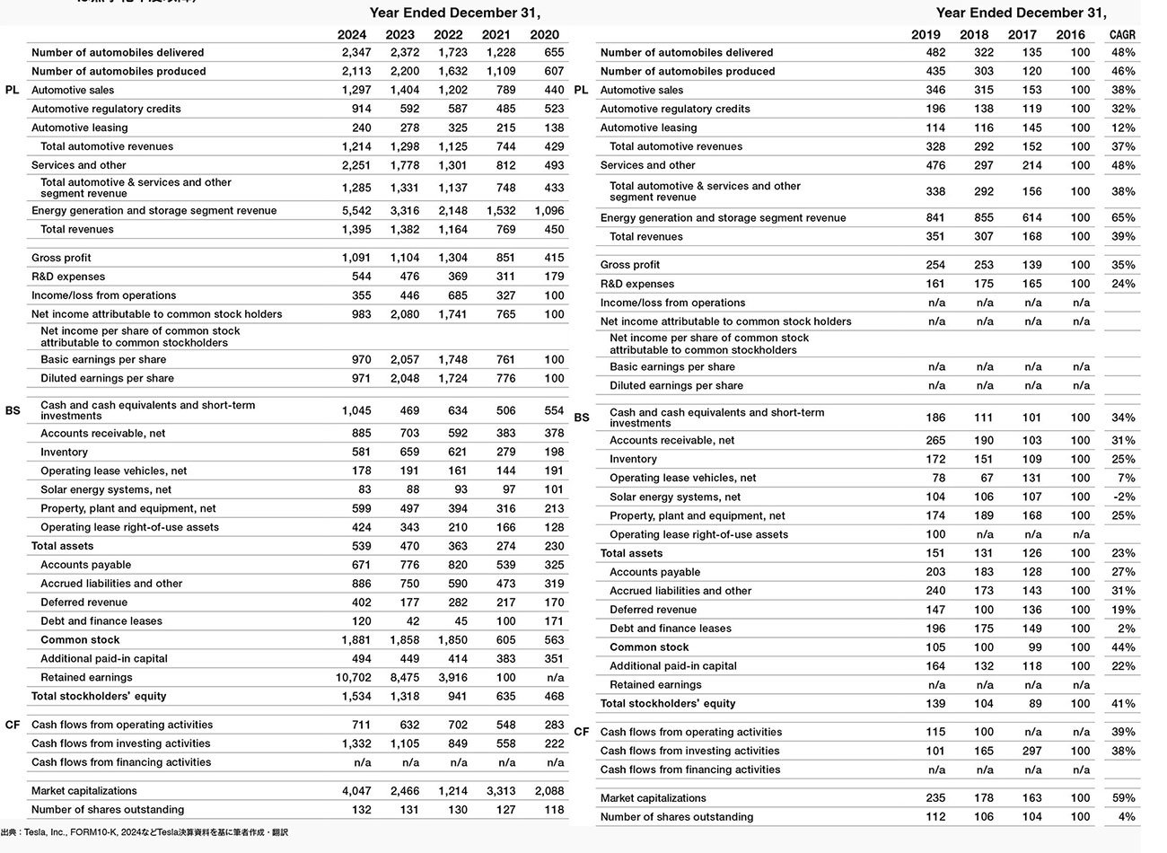 まず、Teslaの決算数値のすべてのベースとなるNumber of automobiles delivered(自動車の納車台数=販売台数)は、2016年12月期を100とすると、2024年は実に2347まで成長していることがわかります。販売台数がたったの8年で23倍超になったことを意味しており、「(2347÷100)^{1÷(8-1)}-1」によって、8年間のCAGRは48%と算出できます。