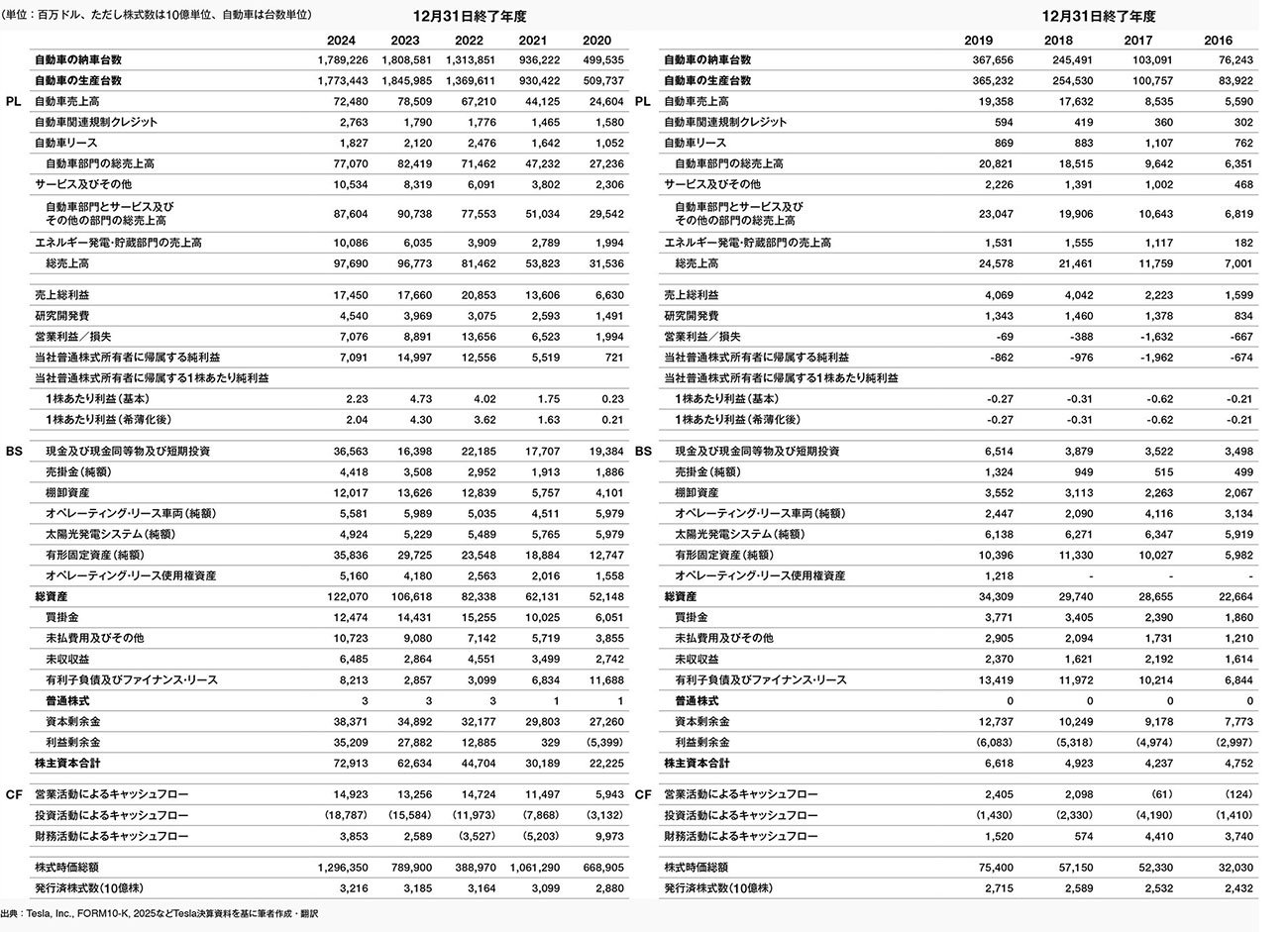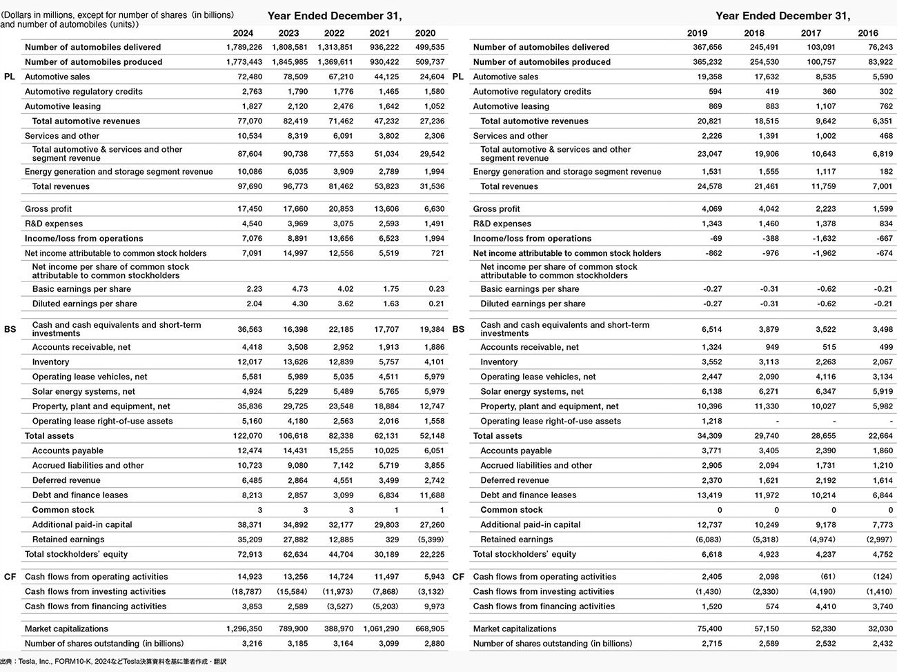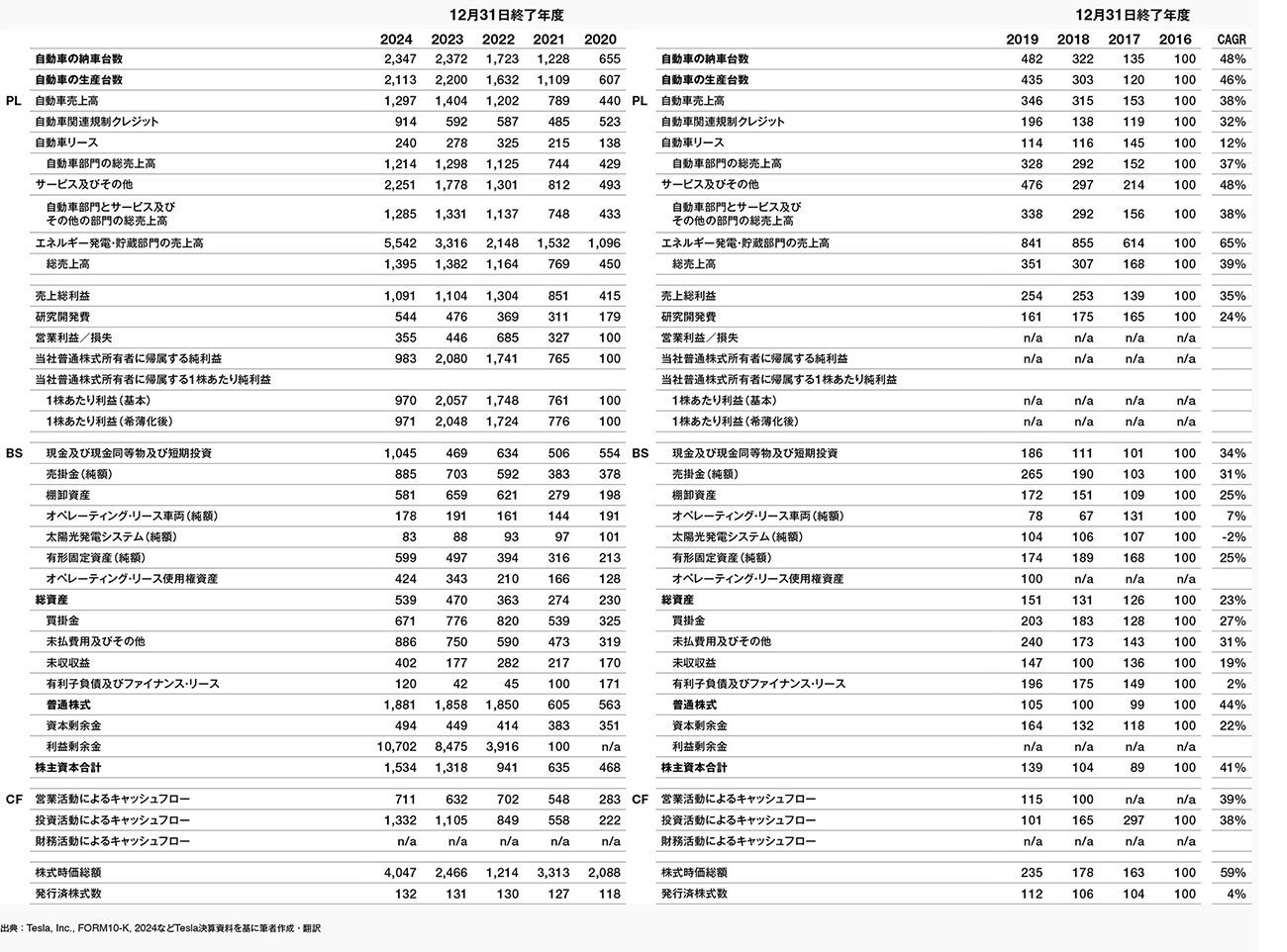 図表1、図表2は、2016年12月期から2024年12月期までのTeslaの主な決算数値の9年間の推移をまとめたものです。この資料を渡されて、「さあ、Teslaの成長について評価してください」と言われても、各数値が大きくかつ大小関係がマチマチなので、どこから手を着けてよいか途方に暮れてしまいます。