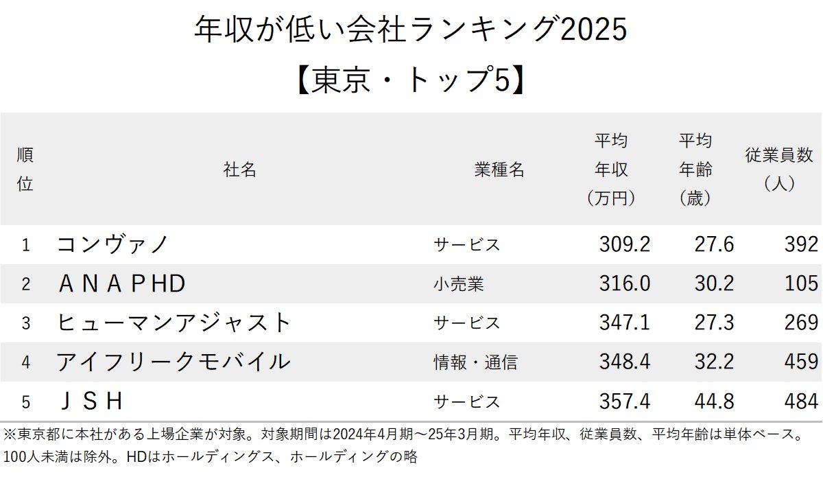 今回は、上場企業の有価証券報告書に記載された平均年収のデータを基に、東京都に本社がある上場企業を対象として「年収が低い会社ランキング2025【東京】」を作成した。単体の従業員数が100人未満の企業は除外している。対象期間は、2024年4月期~25年3月期。