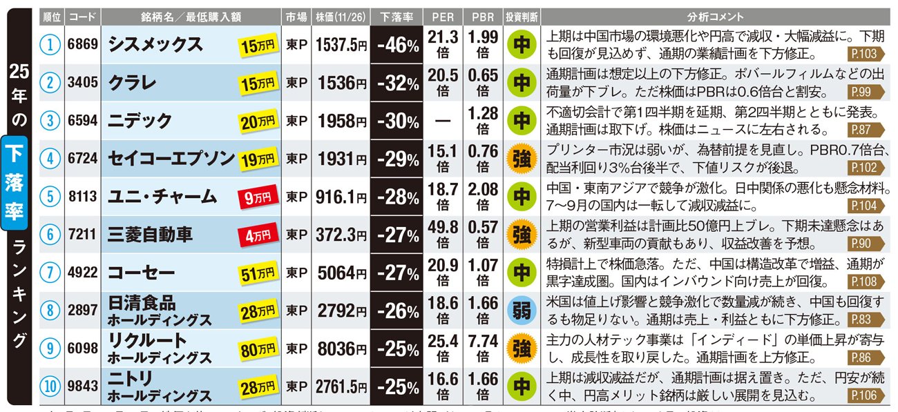 中国経済の減速や、競争激化の煽りを受けた消費財・素材メーカーが並んでいる。円安も逆風となった。ただし、悪材料の出尽くしから株価反転も見込まれ、10銘柄中3銘柄が「強気」に。実力はあるが一時的な要因で売られた銘柄は、見直し買いが入る可能性も高いだろう。