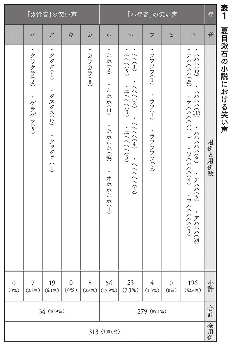 ( )内の数字は、その笑い声が何回見られたかという用例数です。たとえば、「ハハハ(12)」と書いてあったら、夏目漱石の作品では、「ハハハ」という笑い声が、12回使われているという意味です。