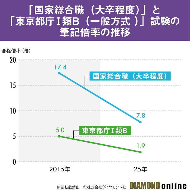 この潮流は、いわゆる“難関試験”にも及んでいる。高倍率の代表格だった「国家総合職(大卒程度)」や「東京都庁Ⅰ類B(一般方式)」は、この10年間で急落した(下図参照)。