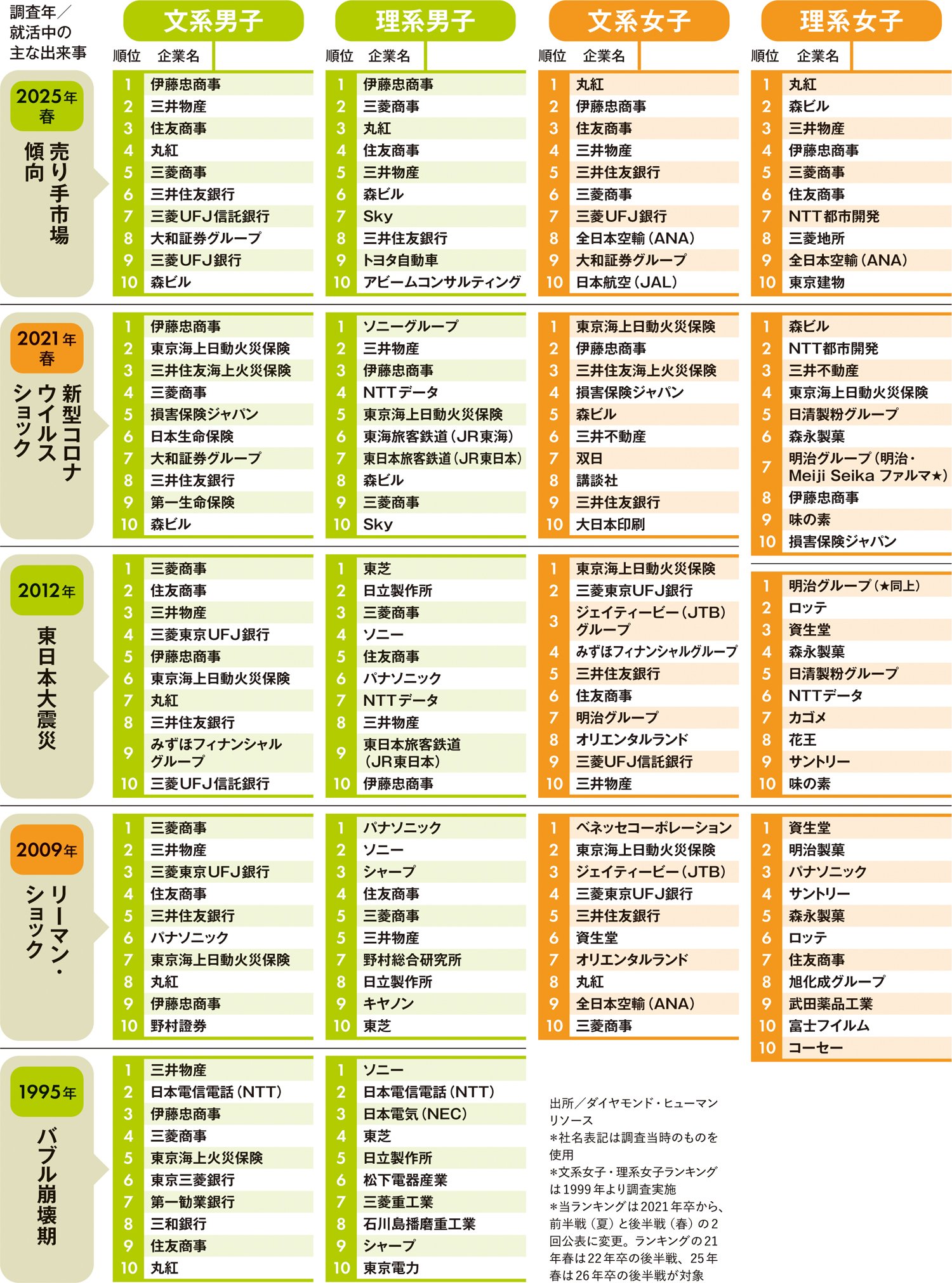 12年は、東日本大震災の影響で日本経済の先行き不透明感が増した。また、倫理憲章(*)の改定で就職活動は短期集中化し、大手安定志向が強まった。総合商社や大手金融機関、食品系の人気が目立った。