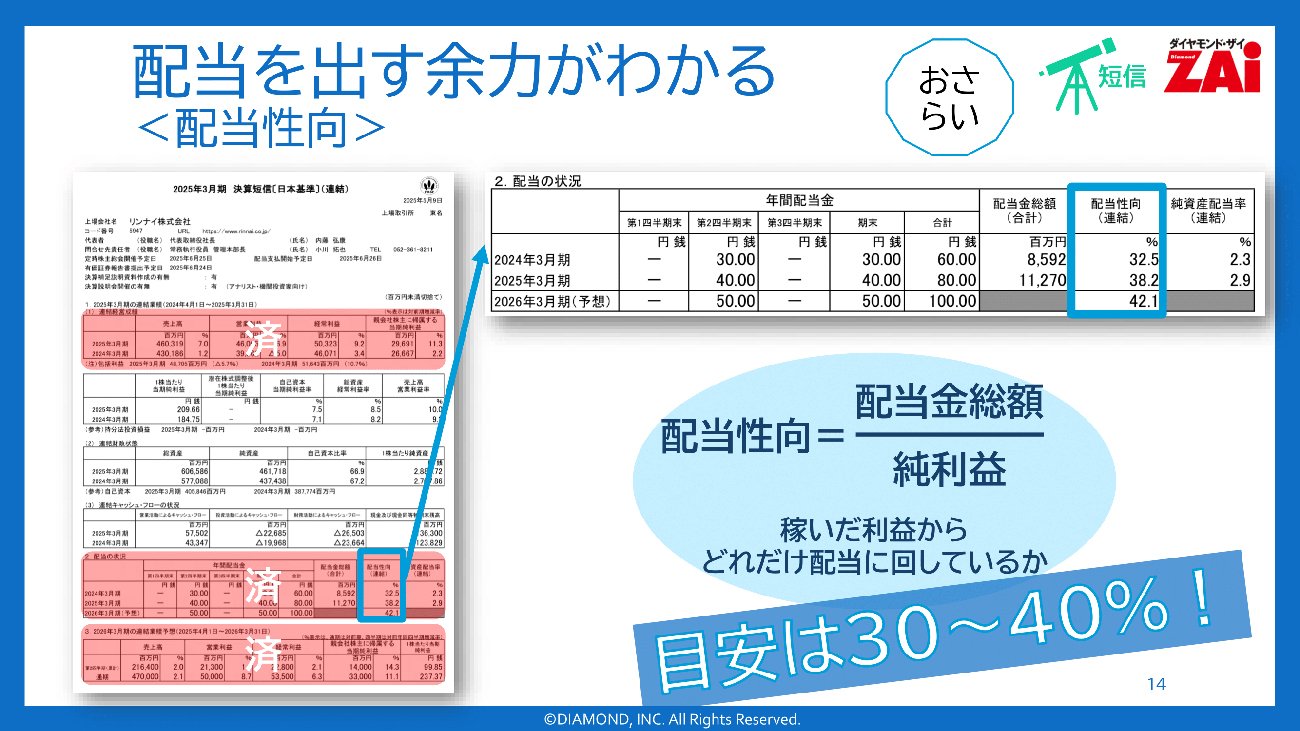 小林はい。これは「利益のうち何%を株主に配当として還元しているか」を示すものです。式は「配当金総額 ÷ 純利益」ですね。