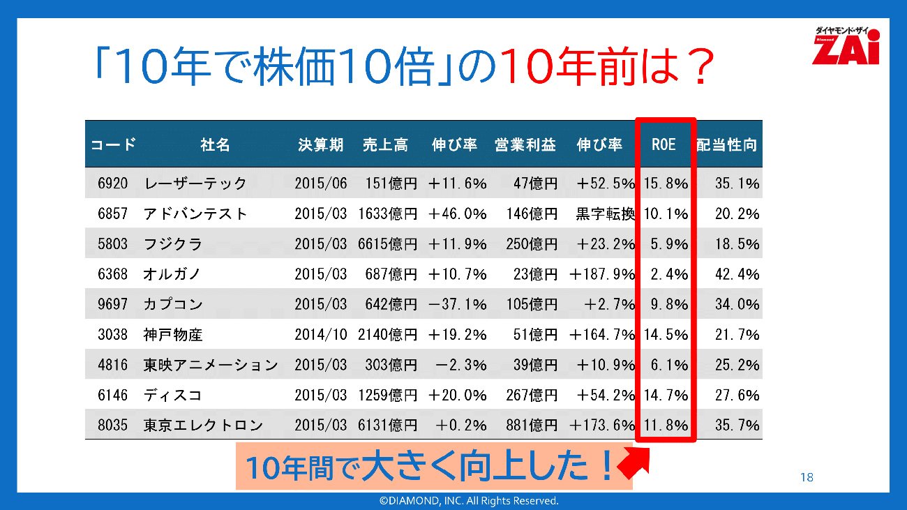 小林そうなんです。他の10倍株も同様で、最初から現在のような圧倒的な高ROEだったわけではありません。