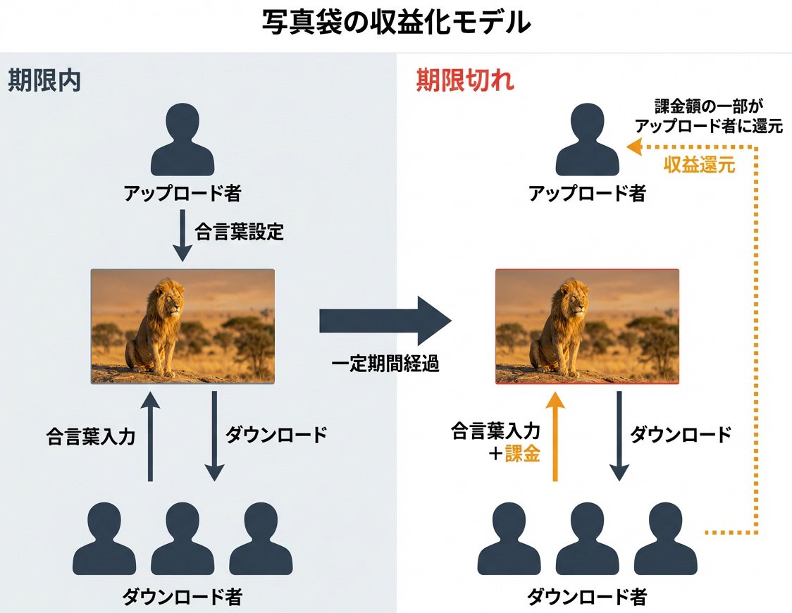 写真袋でアップロードした写真には閲覧期限があり、一定期間が過ぎると合言葉を入力してもダウンロードはできなくなる。しかし、課金アイテムを使用すると期間が過ぎた写真もダウンロードすることができ、その課金額の一部はアップロード者に還元されるという仕組みになっていた。