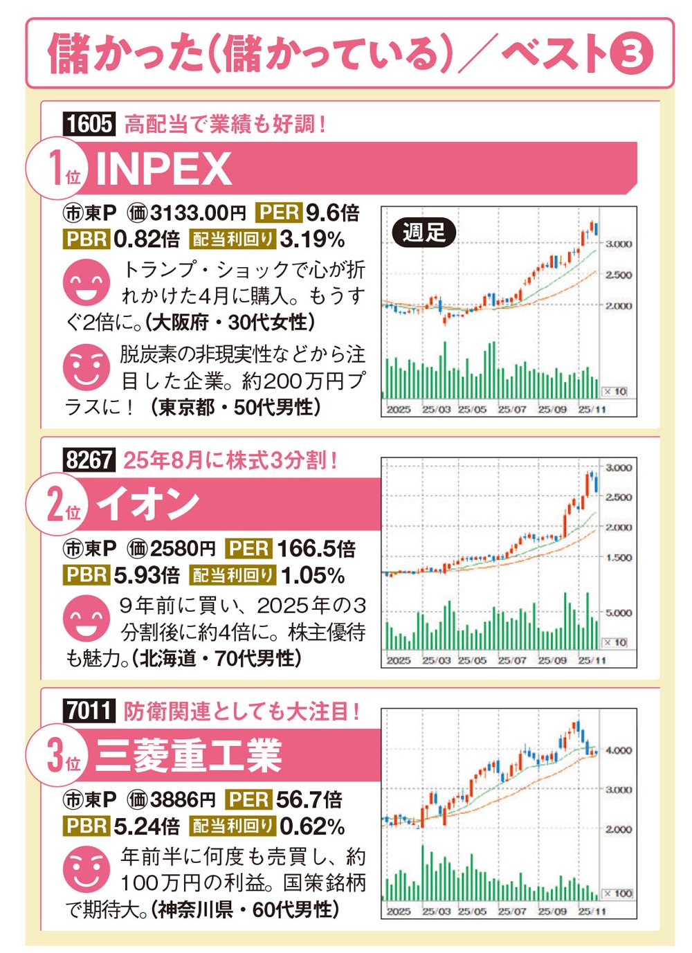 「3銘柄とも、まず何といっても決算が好調です。それに加え、INPEXとイオンは配当や株主優待など株主還元に積極的で、個人投資家の人気が高い。三菱重工業は、2025年の1年間を通してずっと注目されていた防衛関連の“ど真ん中”の銘柄。高市早苗首相になったことで、国策銘柄として今後も上昇が期待できます」(仲村さん)