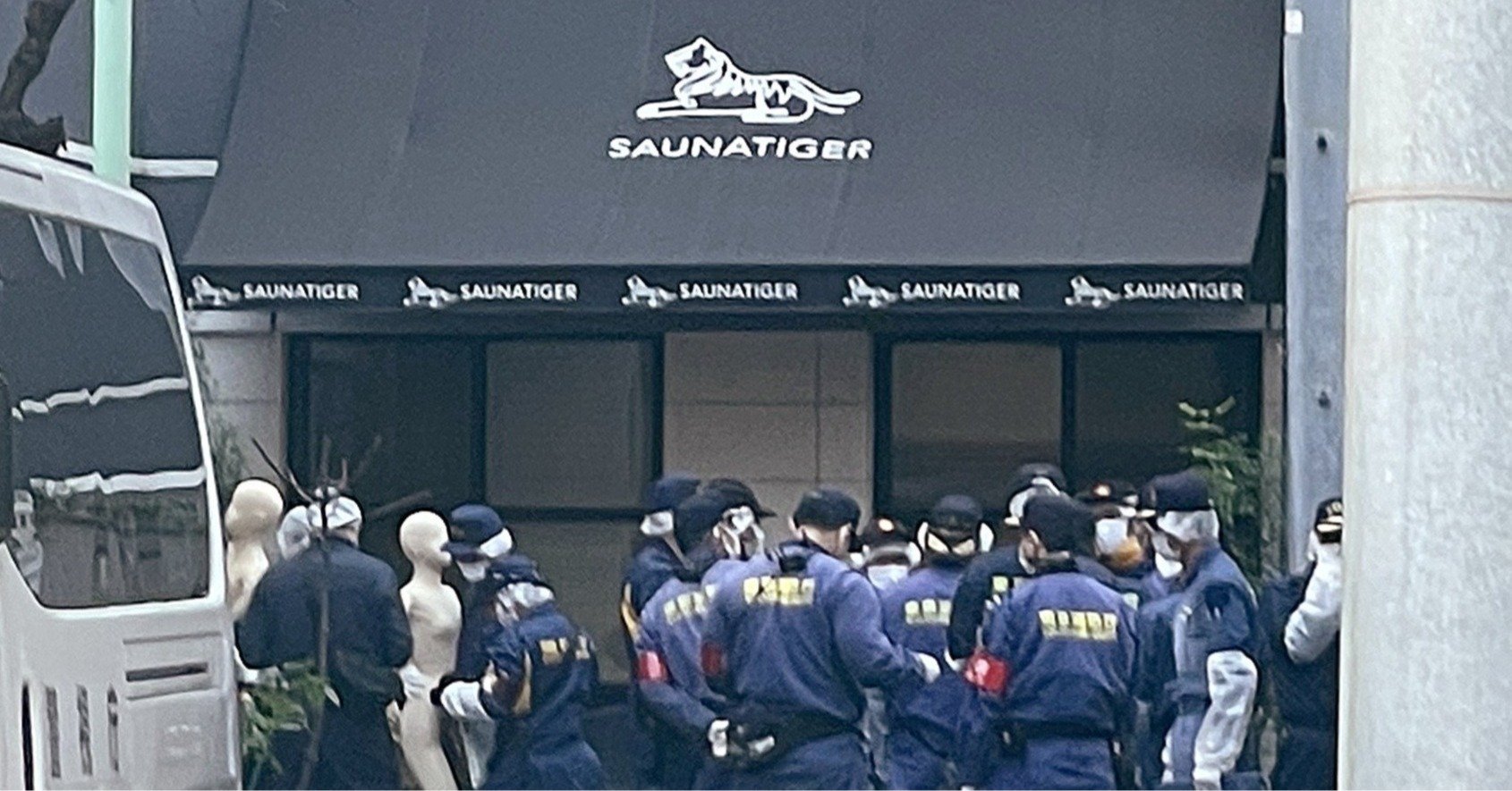 死亡事故が発生した個室サウナ店を調べる警視庁の捜査員 Photo:JIJI