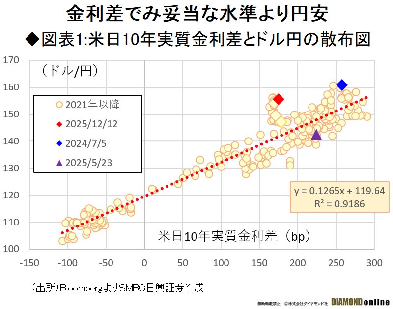 2025年12月にFOMC(米連邦公開市場委員会)は0.25%の利下げを決めたが、26年以降はいったんは利下げ見送りを示唆した。失業率上昇で米10年金利は4.0%割れを視野に入れ、ドル円は金利差に比べて円安に乖離している。背景には投機筋の円売りがある。米利下げ再開、長期金利低下で26年は145円まで円高余地がある一方、実需の円売り状態が継続することで中期的には160円超となる可能性は否定できない。(SMBC日興証券 チーフ為替・外債ストラテジスト 野地 慎)