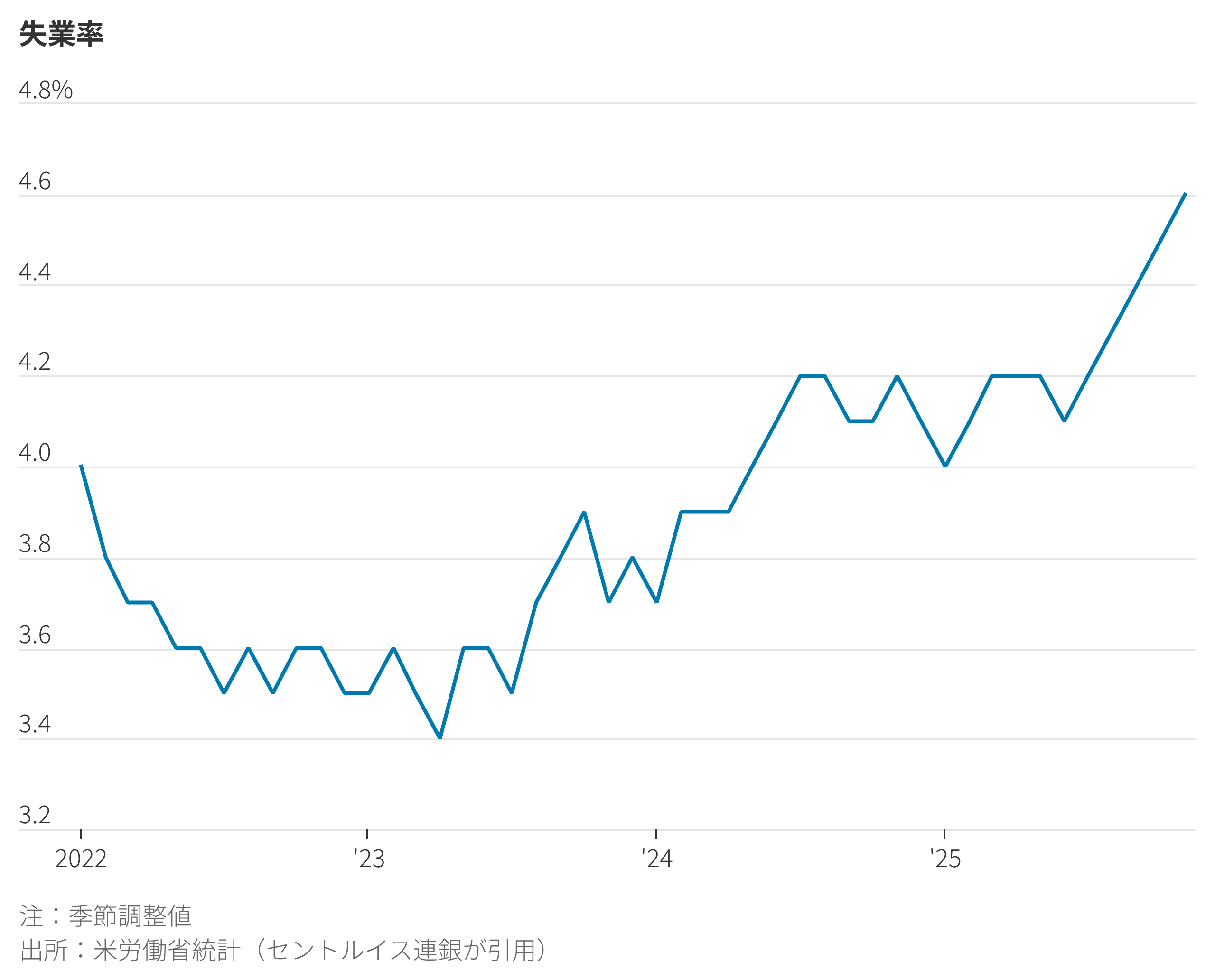 米国の労働市場は弱含みで2025年を終えようとしている。企業は大規模な人員削減には踏み切らなかったものの、人員を削減した企業は多かった。特に年後半はそうした傾向が顕著だった。また、採用を停止した企業も多かった。退職者数は減った。賃金上昇率は鈍化した。失業率は年間を通じて上昇し、11月は4年ぶりの高水準に達した。失業者数は70万人余り増えて780万人となった。以下の5つのチャートでその詳細な状況を示した。米国の就業者数の伸びは年初来で50万人弱にとどまる。2024年1~11月の160万人と比べると、大幅な減速だ。今年は失業率も悪化し、特に下半期の上昇が目立つ。11月末時点で4.6%と、2021年以来の高水準にある。