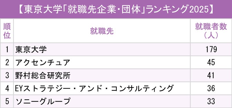2024年の東大の「就職先企業・団体」ランキングでは、1位が東大、2位がアクセンチュア、3位がソニーグループだった。